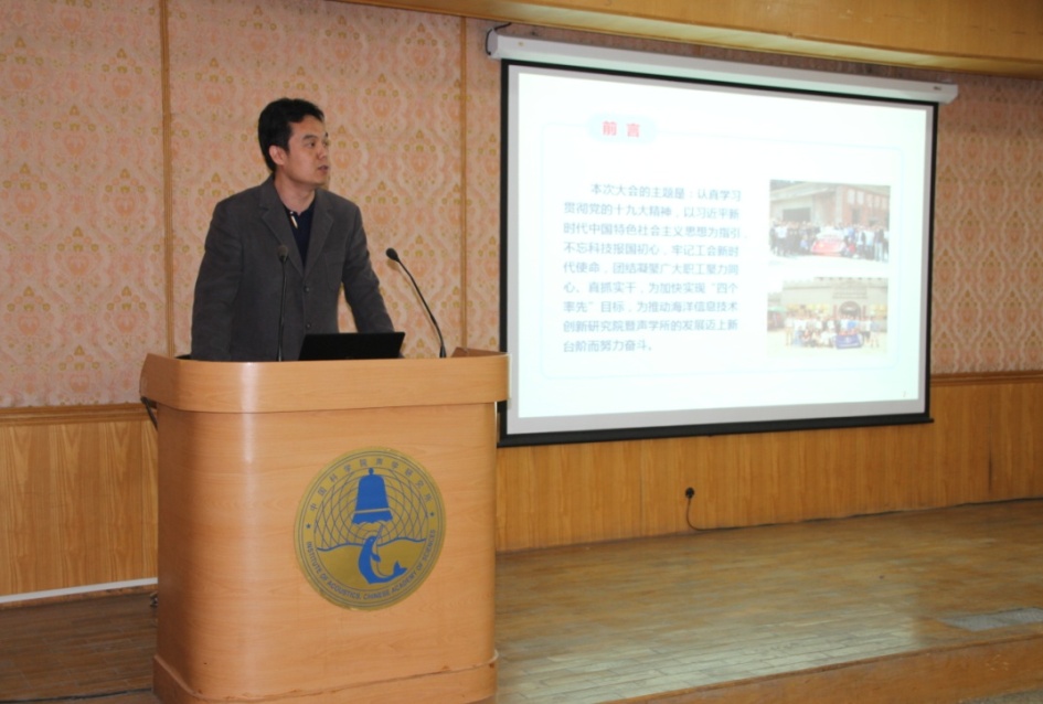 本次大会的主题是:认真学习贯彻党的十九大精神,以习近平新时代中国特色社会主义思想为指引,不忘科技报国初心,牢记工会新时代使命,团结凝聚广大职工聚力同心、真抓实干,为加快实现“四个率先”目标,为推动海洋信息技术创新研究院暨声学所的发展迈上新台阶而努力奋斗。