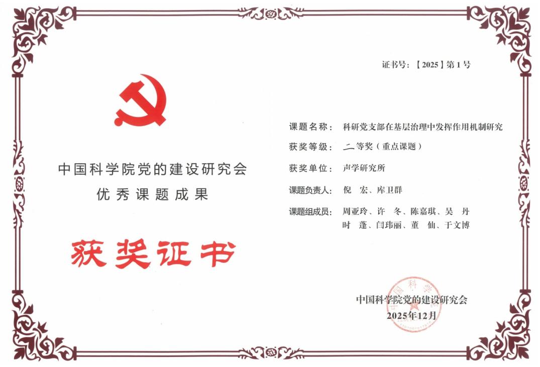 12月3至5日,中国科学院党的建设研究会2025年课题成果交流评选会在兰州召开。会议评选了2025年优秀课题成果,由声学研究所牵头,联合昆明分院、自动化研究所、国家空间科学中心等单位共同承担的重点课题《科研党支部在基层治理中发挥作用机制研究》获二等奖。声学所党办主任闫玮丽代表课题组参加会议并作报告。