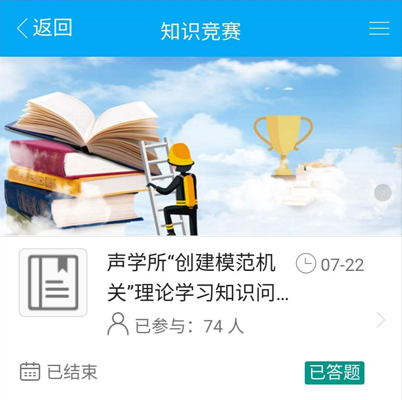 推进声学所创建模范机关工作深入开展,机关党支部、机关分工会联合举办了“创建模范机关”理论学习知识问答活动,问卷借助中科院云工会平台知识竞赛栏目进行网上学习和答题,系统自动判卷。机关各部门共有74名职工参加了答题活动,其中党员同志50名,占全部党员总数的91%。所有参加答题的同志成绩均在90分以上,其中满分20人。