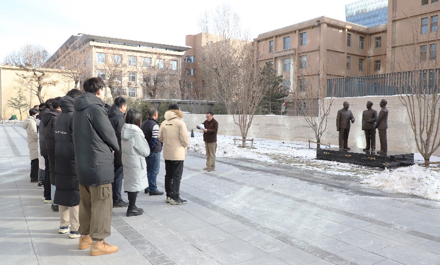 田杰带领大家瞻仰“汪德昭 马大猷 应崇福”院士塑像,全体同志向塑像三鞠躬,并向老科学家们致以最崇高的敬意!