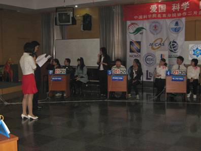 下半场激烈的决赛扣人心弦。进入决赛的六支代表队分别是声学所、电子所、化学所、过程所、电工所和理化所代表队。在第一轮的必答题环节中,每位选手都要回答一题,我所的三位选手表现出色,全部答对了题目,获得了30分的满分成绩。经过三轮比试之后,电子所和工程所略逊一筹,其他四个代表队暂时领先。第二轮的共答题环节,各代表队稳扎稳打,小心谨慎,比分没有明显落差,可见各队的实力很强,队员事先进行了充分的准备。我代表队没有失误,准确无误的回答了题目,再获20分。最紧张激烈的是第三环节抢答题,各队既要反应机敏又不能违反抢答规则,大家都想在这一环节拉开与对手的比分,扩大优势,场上气氛紧张热烈。我所拉拉队热情高涨,不时在台下为场上选手呐喊助威。在这一轮中,由于两次抢答违反规则,我代表队最终抢答了一题,暂居第四,但他们毫不示弱,决心在最后一轮扳回比分。风险题环节中,各队斗智斗勇,6个队全部选择了风险系数最高的高难度题目,都想抓住最后的反超机会,出乎意料的是最终各队全部顺利完成了作答,都获得了50分的满分成绩。这样,理化所以230分夺得本次竞赛一等奖,化学所、电工所二等奖,声学所、过程所、电子所获得了三等奖。