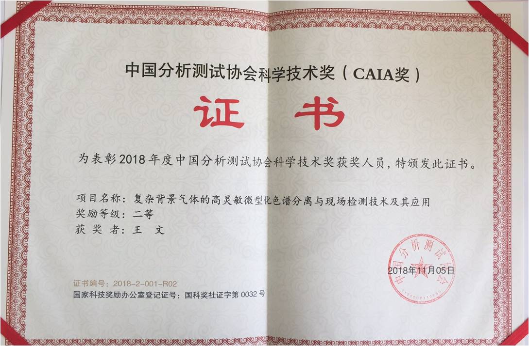 近日,声学所超声技术中心王文研究员及何世堂研究员等与中科院电子所联合申报的“复杂背景气体的高灵敏微型化色谱分离与现场检测技术及其应用”项目,荣获2018年度中国分析测试协会科学技术奖(CAIA奖)二等奖。