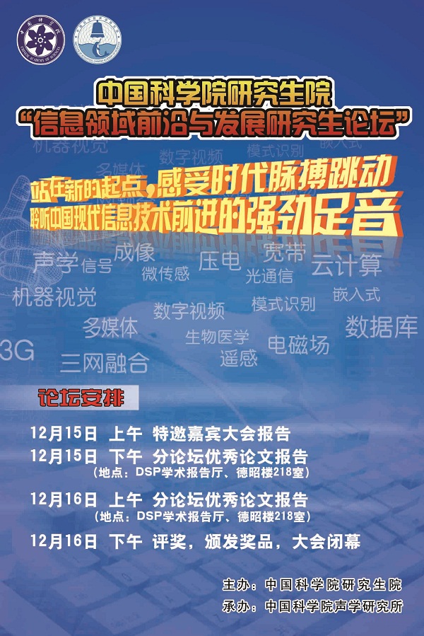 站在新的起点,感受时代脉搏的跳动,聆听中国现代信息技术前进的强劲足音。为此,由中国科学院研究生院主办,中国科学院声学研究所承办的以“信息领域前沿与发展”为主题的2011年“信息与通信工程”学科学术论坛,于2011年12月14日-16日在北京举行。论坛为北京乃至全国各高校、科研院所的研究生提供该领域的交流平台,增进同行业间的了解与沟通,同时进一步激发研究生科研、创新的热情,推动信息技术的进一步发展。