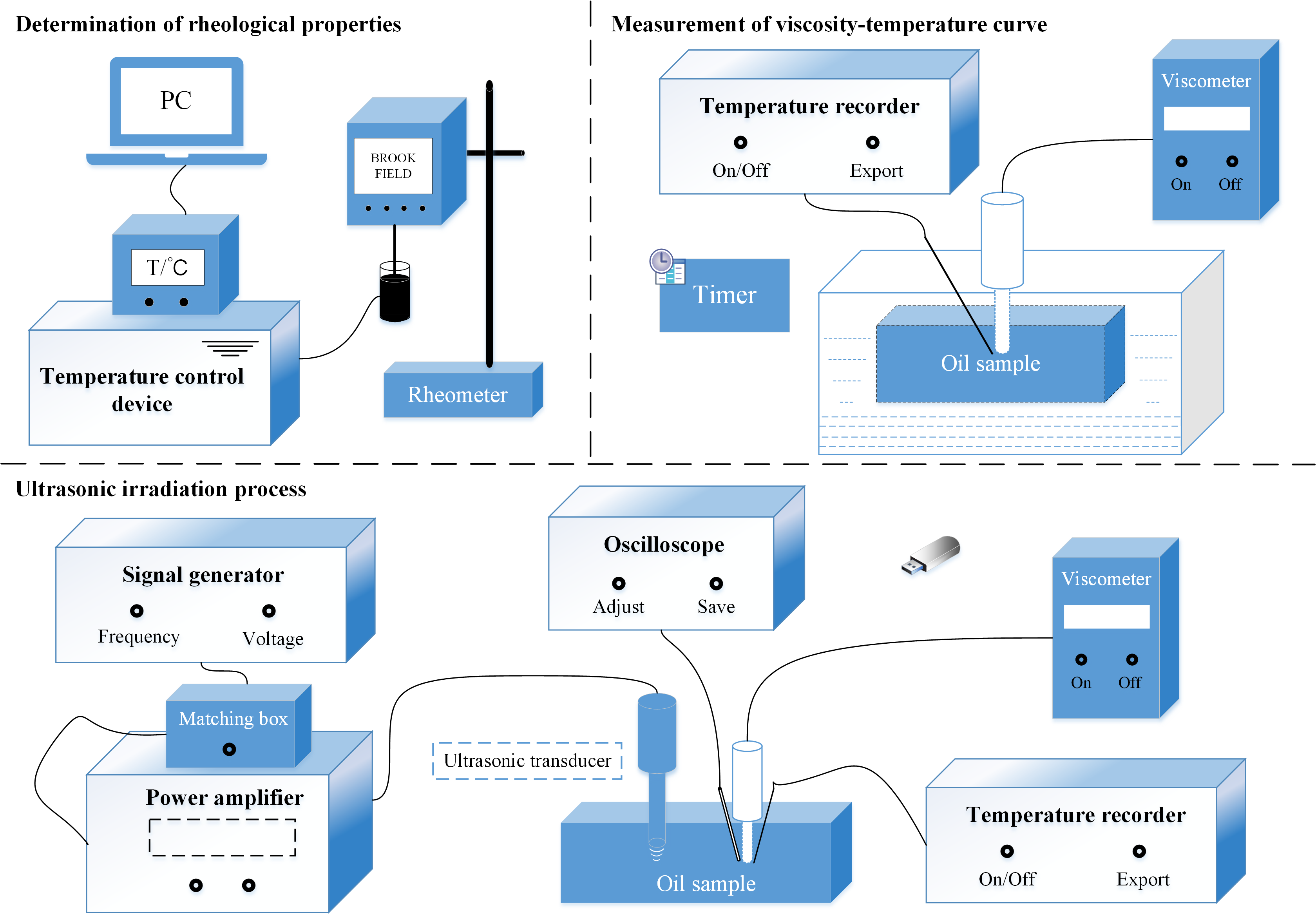 超声作用引起重油黏度变化机理的相关研究对于超声波技术在重油的勘探、开发及运输等方面的应用具有重要的意义。研究人员大多基于超声作用前后重油的黏度测量开展实验,很少有学者对超声作用过程中重油黏度的实时变化进行表征,而借助相关分析方法揭示黏度实时变化机理的研究则更少。
