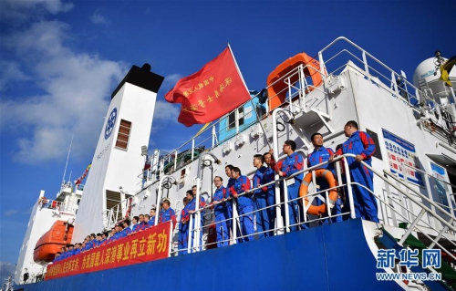 10月3日,“深海勇士”号载人深潜试验队队员在等待靠岸。新华社记者郭程摄