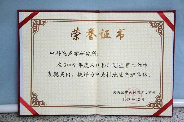 2009年,声学所同北京市海淀区中关村街道办事处签订了“人口与计划生育目标管理责任书”,截止到目前为止,声学所做到了责任书的各项要求,实现计划生育率100%。