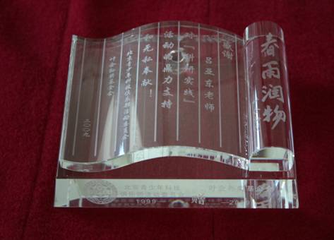 2009年7月12日上午,在第七届北京青少年科技创新市长奖颁奖典礼与北京青少年科技俱乐部成立十周年纪念暨谢师会上,声学所及所属噪声与振动实验室作为最早成为俱乐部学术指导中心,获得了“以茅以升命名的水晶杯”;我所吕亚东研究员作为最早加入俱乐部的十位导师之一,获得了“以叶企孙命名的水晶竹简”;并对我所及科研人员在该俱乐部成立十年间对高中学生走进科学和科研实践活动中的辛勤付出表示了感谢。