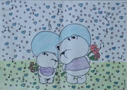 我们在“关爱儿童之家”学校受到学校老师和孩子们的热烈欢迎,我们先是给学校孩子们播放了有关声学的科普知识短片,之后学校的汪老师带我们参观了孩子们的教室、宿舍楼、餐厅和活动室。孩子们上课的教室干净整洁,宿舍的内务整齐划一而又不失温馨。看见孩子们的学习、住宿环境我了感欣慰,汪老师说教室里的课桌、凳子、黑板书本、电视以及宿舍的家具都是社会单位和人士捐赠的,社会的关爱一点一点的给这个学校添砖加砙,社会各界人士对孩子们的关爱才让他们有了这个温馨的家院。宿舍楼门口墙壁上挂了一些孩子们的作文和绘画,我看见一幅很温馨的蜡笔画,画中描绘了一个充满爱心和音乐和世界,一只大熊细心呵护着年幼的小熊。画中所述应该就是“关爱儿童之家”孩子们相互关爱的世界吧!