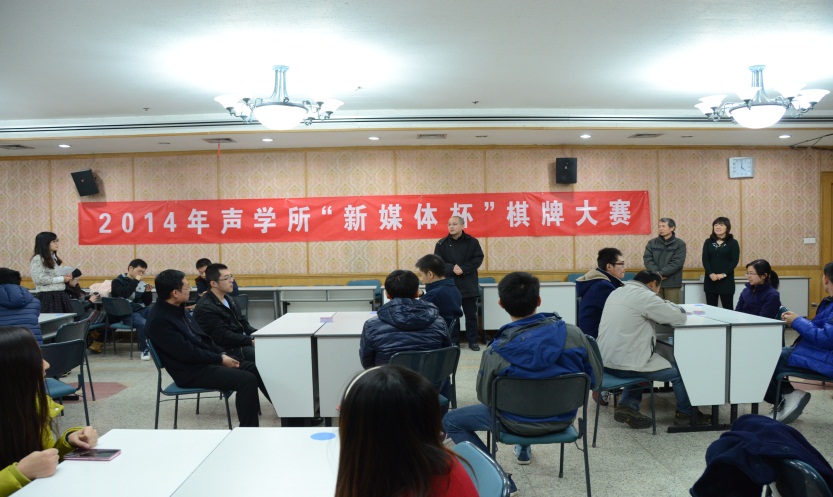 2014年12月2日,由声学所工会、声学所团委主办,国家网络新媒体工程技术研究中心赞助,声学所棋牌协会承办的一年一度的 “新媒体杯”棋牌赛在声学所DSP多功能厅隆重开幕。“新媒体杯”棋牌大赛为我所传统活动,旨在活跃声学所广大职工与学生的业余生活。通过本次比赛希望选手们在繁忙的科研之余劳逸结合,增进交流,缓解工作压力,提高科研效率。本届棋牌大赛分为升级大赛和三国杀挑战赛,我所职工和研究生参与积极,共有41支队伍,96人参加比赛。其中升级比赛设在DSP多功能厅,有27支参赛队伍,三国杀挑战赛设在北二楼活动室,共14支参赛队伍。