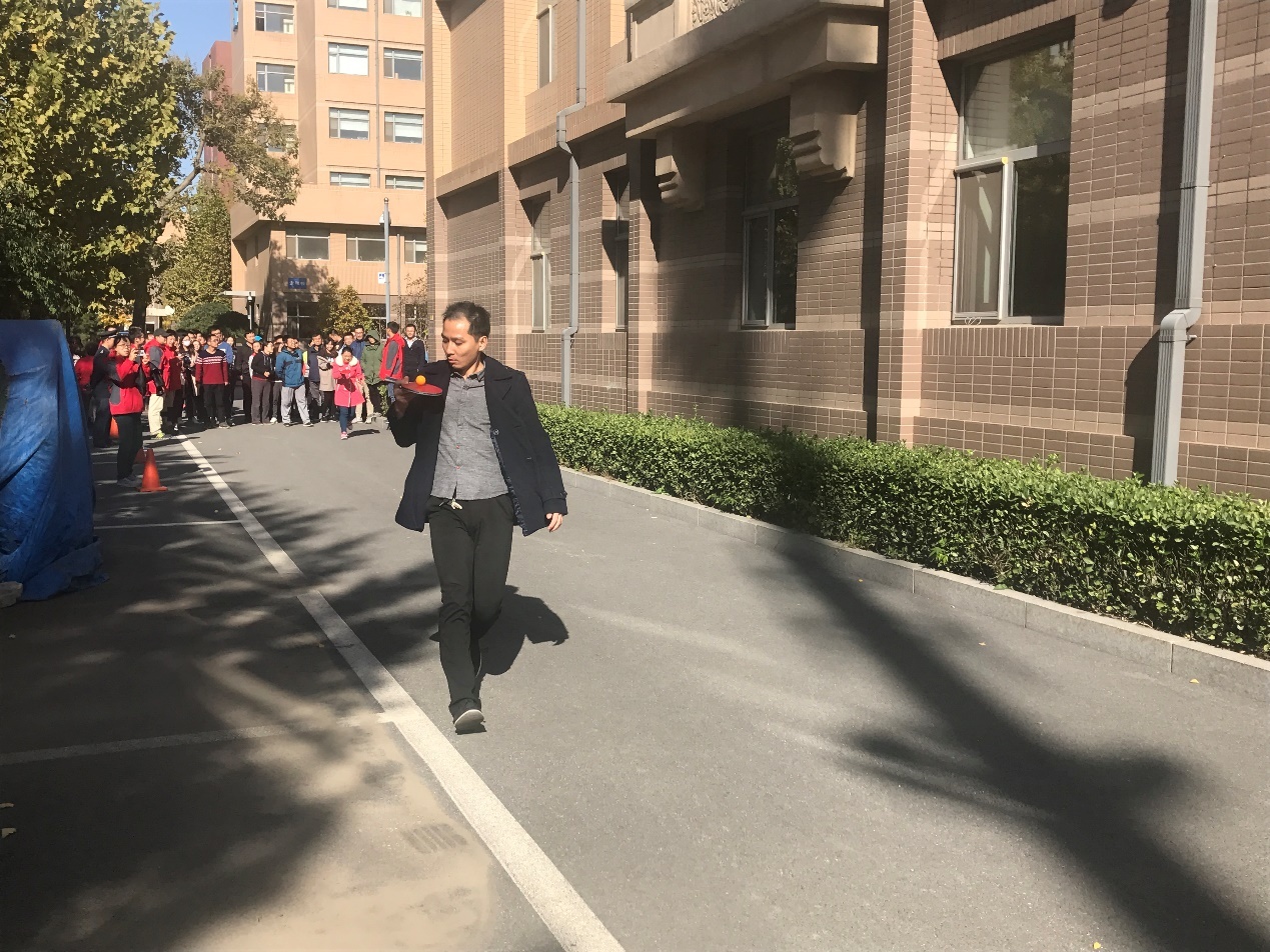 最后一场比赛是最为紧张刺激的托球跑接力赛,因为这是一项团体项目,每个参赛运动员都十分认真专注。运动员们用乒乓球拍托着乒乓球快速跑动,乒乓球在球拍上每一次转动都会引起观众们一声声惊呼,每一位运动员成功返回都会引来一阵阵喝彩。比赛刚一开始,网络新媒体的宋磊老师就迫不及待地托着球往前跑,但是由于比赛当天风比较大,乒乓球一不小心就掉了,宋磊侧向一个箭步俯身捡球,再立刻回到丢球的地方出发,这套动作一气呵成干净利落,他凭借敏锐的身手竟然也不落后别人多少。要说速度最快还是经常健身的脱立恒老师,他依靠自己良好的平衡能力和肌肉控制力,平稳快速地完成了自己这一段,为比赛奠定了优势局面。
