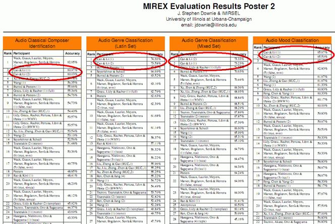 在日前由伊利诺斯大学主办的国际音乐信息检索评测比赛中(Music Information Retrieval Evaluation eXchange 2009),中科信利实验室的音乐小组在比赛中获得了三个单项第一和一个单项第二的好成绩。这次比赛有来自美国、欧洲、亚洲共十几只队伍参加了这次评测。