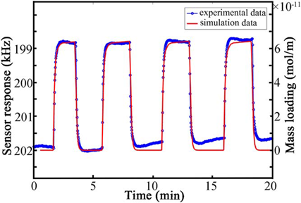 研究人员基于微扰理论、朗缪尔方程和基本传输方程建立模型。利用微扰理论描述传感器输出与表面质量负载之间的正比关系,采用朗缪尔方程和基本传输方程描述气体在敏感膜上的吸附-解吸行为,并利用有限元软件COMSOL得到了质量负载曲线。
