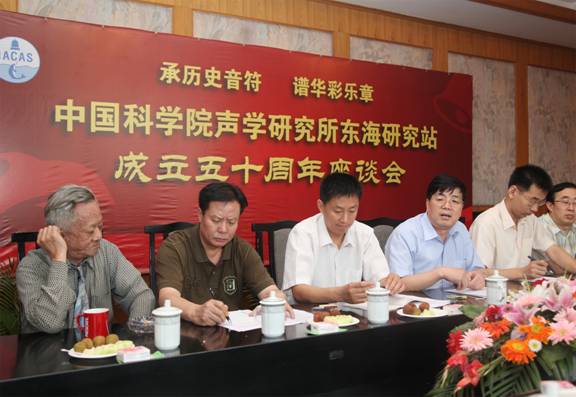 座谈会由胡长青站长主持。五十年弹指一挥间,五十年春华秋实,胡站长首先和与会代表共同回顾了东海站创建的背景和成长的经历,总结了五十年来取得的成就,展望了当今蓬勃发展的良好势头,同时也认识到目前存在的一些不足之处,强调今后应加强引进和挖掘优秀科技人才,培养和锻炼年轻科技人员。在这庆祝建站五十周年的时刻,胡站长代表东海站全体职工缅怀我国水声事业的奠基人、老所长汪德昭先生,东海站的开拓者、老站长朱西先生等驾鹤仙去的老前辈;感谢为创立和建设东海站而付出心血的历任领导和老同志们;尤其感谢至今仍坚守在科研第一线的老专家们,祝愿他们身体健康,生命之树常青。副站长关平在“回顾过去,立足现在,展望未来”的发言中,也提出了今后应着重在技术进步、文化创新、人才培养上加大力度,年轻人应勇挑重担,并提倡科研骨干潜心搞学术研究。