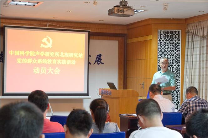 会上站党委书记张胜坚作动员讲话并宣讲了《中国科学院声学研究所北海研究站深入开展党的群众路线教育实践活动实施方案》。他对北海站开展党的群众路线教育实践活动的指导思想、目标任务、方法步骤及活动要求等进行了部署。指出北海站全体党员干部要按照中央和声学所的部署要求,高度重视,统一思想,以为民务实清廉为主要内容,聚焦作风建设,坚决反对形式主义、官僚主义、享乐主义和奢靡之风。紧密结合北海站工作实际,着力抓好“学习教育、听取意见”,“查摆问题、开展批评”,“整改落实、建章立制”三个重要环节,把握声学所青岛基地的建设机遇,推动科技创新和重大成果产出。