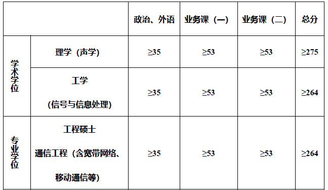 根据中国科学院声学研究所(以下简称“声学所”)2026年硕士生入学考试初试成绩情况,经研究决定,声学所2026年招收全国统考硕士研究生复试分数线如下: