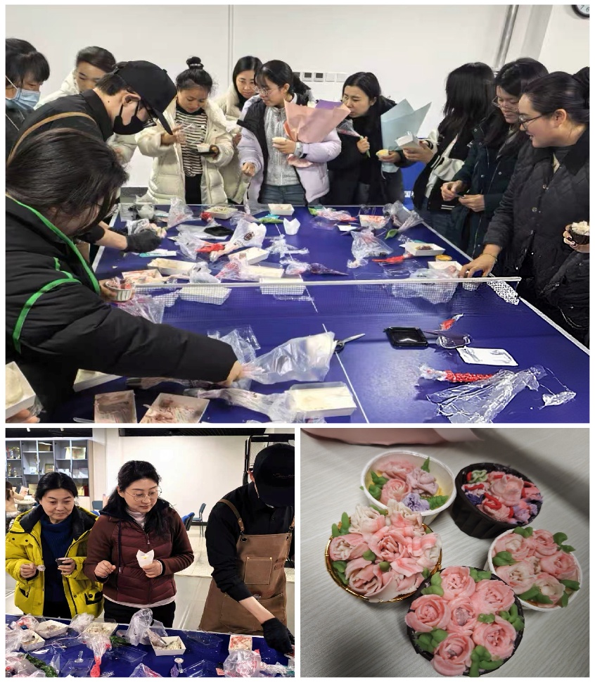 蛋糕裱花制作现场则弥漫着温馨与甜蜜的氛围。在专业老师的指导下,女职工们以白芸豆泥为彩墨、裱花袋作画笔,在蛋糕坯上展开一场细腻的“绘画”。从色彩调配、装填入袋,到手腕转动、轻柔挤花,每一个动作都凝聚着专注与匠心。经过女职工们的巧手制作,一朵朵栩栩如生的豆泥花朵跃然“糕”上。大家在制作中分享心得、传递美好,享受的不仅是手工创作的宁静时光,更是彼此陪伴、共同成长的温暖情谊。