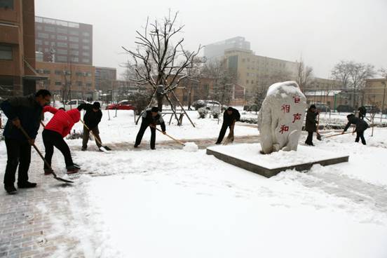 飘飘洒洒的雪花在不断飞舞,但这丝毫都无法影响大家扫雪的热情。环声物业、实验室、机关、团委、党支部,或成建制,或骨干带头,大家不畏严寒,铲冰扫雪。激情会感染,热情会传播,很多同志都是刚到所里,还没来得及放下包,便加入了扫雪的队伍。同志们自觉地三五一组,或铲或推或扫,紧张而有序的工作着。任凭汗水悄悄滑落、冰冷的雪水打湿了鞋袜,大家依然热火朝天,干劲十足。