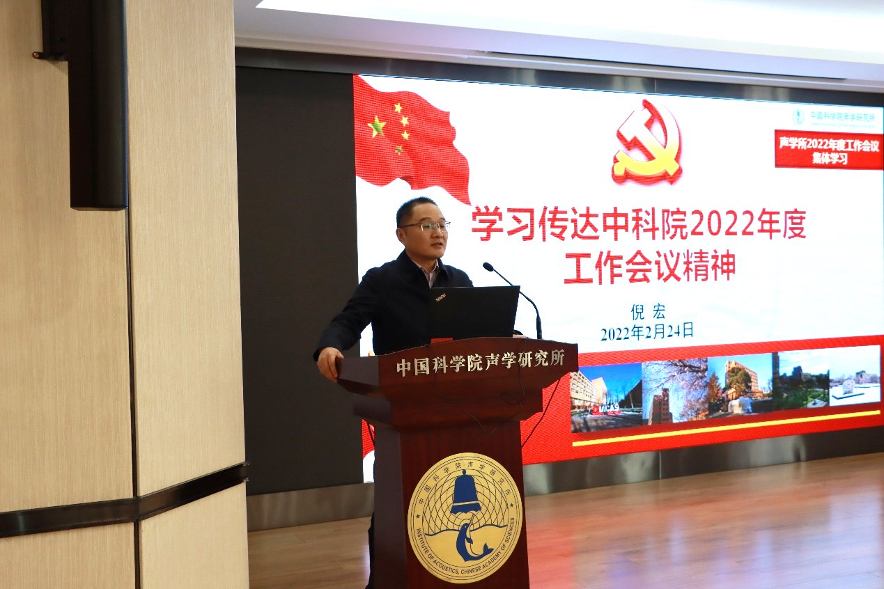 2022年2月24日至25日,中国科学院声学研究所在京召开主题为“担当2022”的年度工作会议。声学所所长李风华、党委书记兼副所长倪宏、副所长李明庚、党委副书记兼纪委书记李浩然、副所长杨军,声学所党委委员、纪委委员、职代会正副主席,声学所各研究单元主任、职能部门主任、四级(及以上)职员、各党总支(支部)书记等近70人参加会议。张仁和、侯朝焕两位院士应邀出席会议。
