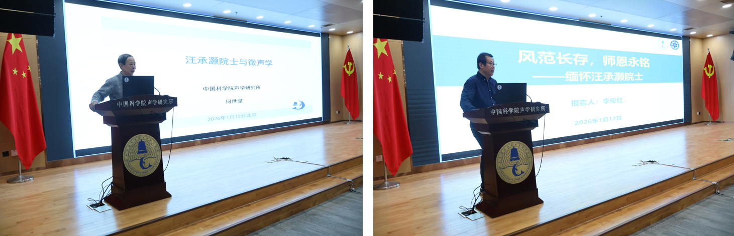 2026年1月12日,中国科学院声学研究所举行专题报告座谈会,缅怀追思我国著名物理学家、超声学家汪承灏院士。所领导、老领导和老同志代表、各部门和研究站职工代表、青年学生代表、超声学实验室全体人员、汪承灏院士家属等200余人分别在现场或线上参会。纪委书记王雷主持会议。